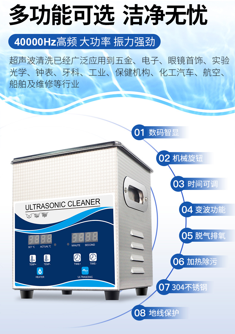 1.家用適用范圍:清潔高檔手表、品牌眼鏡、珠寶首飾等貴重物品和表鏈、水筆、光碟、刮須刀、梳子、牙刷、假牙、 茶具還有奶瓶、 奶嘴具等各類日用品,以及清洗水果、蔬菜、魚肉、碗碟筷等。