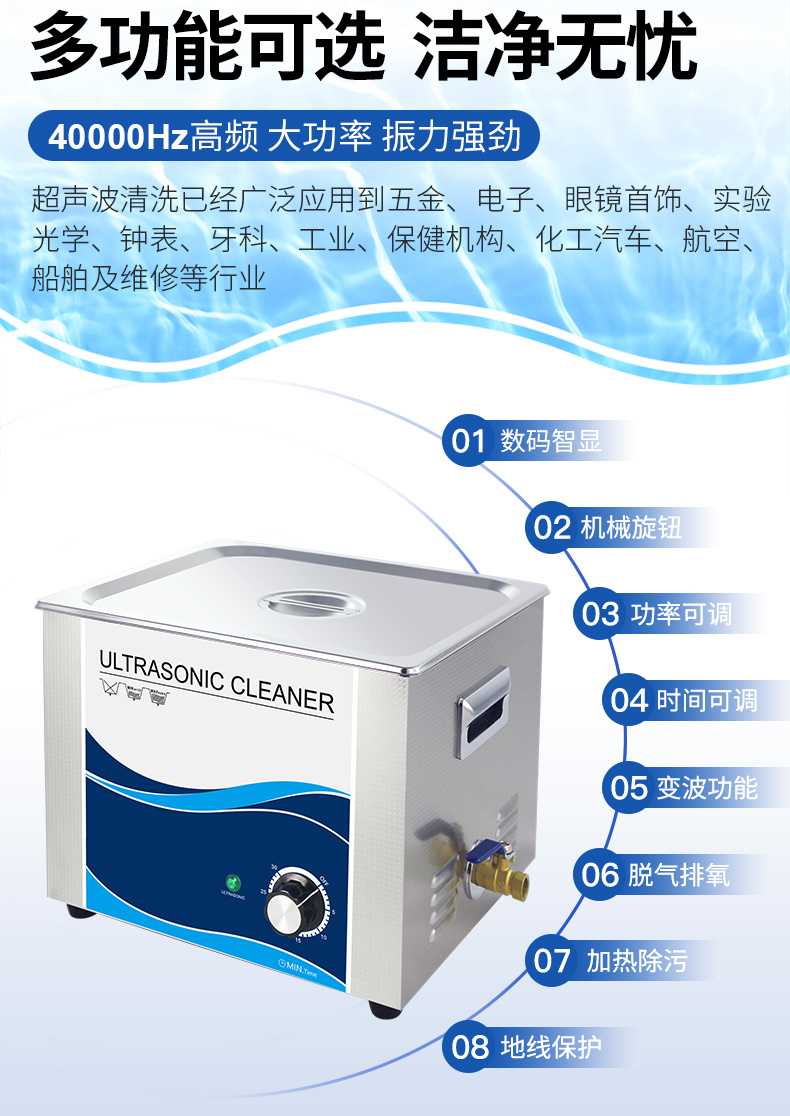 1.家用適用范圍:清潔高檔手表、品牌眼鏡、珠寶首飾等貴重物品和表鏈、水筆、光碟、刮須刀、梳子、牙刷、假牙、 茶具還有奶瓶、 奶嘴具等各類日用品,以及清洗水果、蔬菜、魚肉、碗碟筷等。