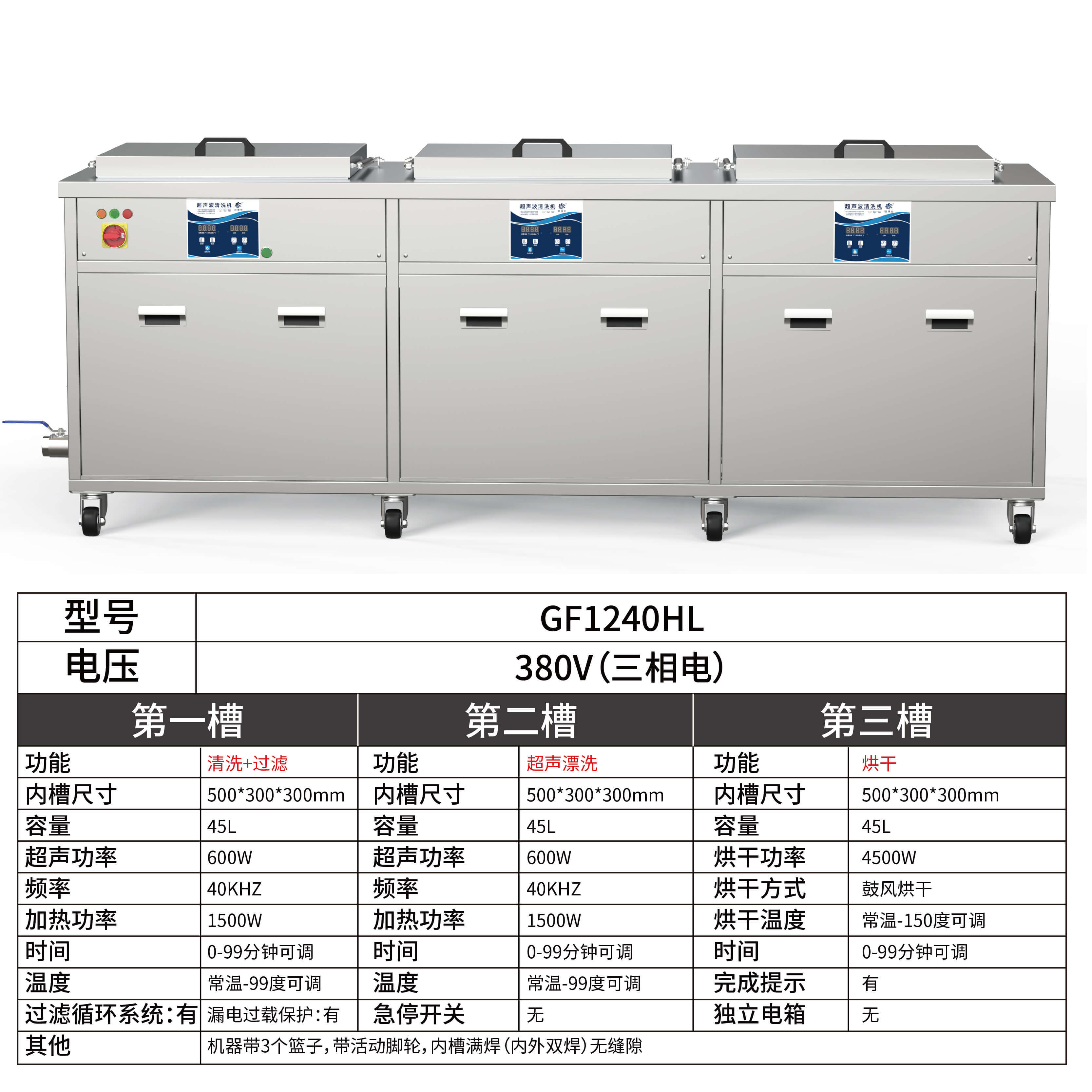 冠博仕GF1240HL三槽超聲波清洗機(jī) | 45L/600W | 大型工業(yè)過(guò)濾漂洗烘干汽修模具五金除油銹清潔器