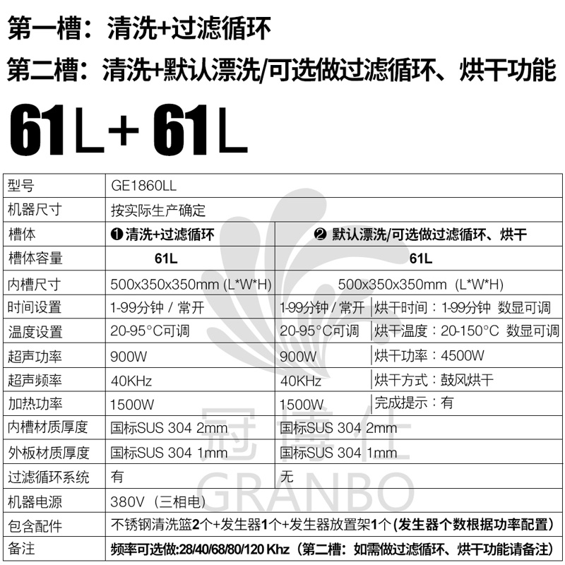 冠博仕GE1860LL|雙槽超聲波清洗機(jī)|61L/900W支持定制