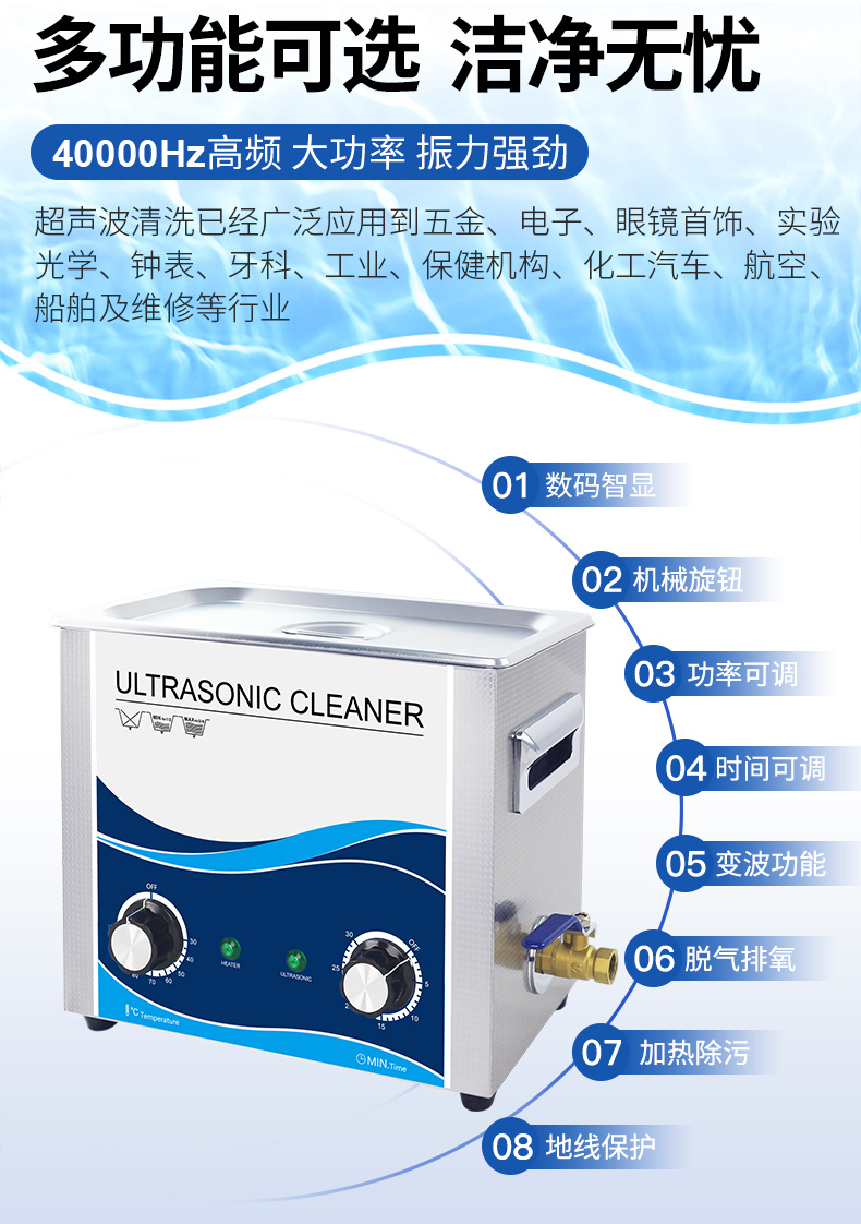 1.家用適用范圍:清潔高檔手表、品牌眼鏡、珠寶首飾等貴重物品和表鏈、水筆、光碟、刮須刀、梳子、牙刷、假牙、 茶具還有奶瓶、 奶嘴具等各類日用品,以及清洗水果、蔬菜、魚肉、碗碟筷等。
